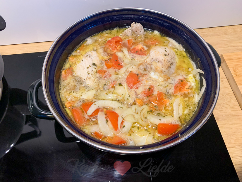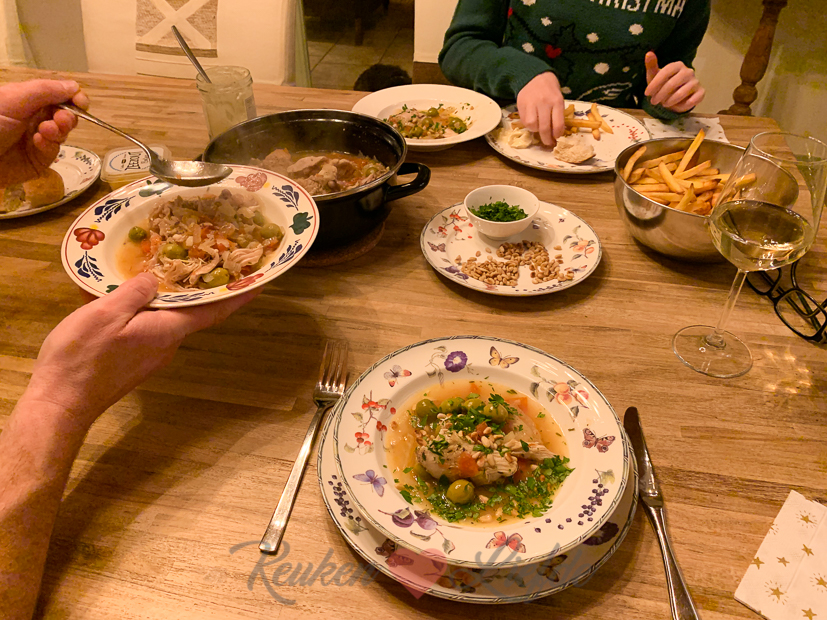 Om twaalf uur heb ik met een vriendinnetje afgesproken om te gaan lunchen in Zaltbommel. We strijken neer bij Restaurant De Verdraagzaamheid en hebben heerlijk bijgekletst en gegeten. Johan en Ella gaan ook samen de hort op; onder andere naar de Action, het tuincentrum en boodschappen doen. Als ik thuiskom zit er een stroopwafelcake in de oven, zit Ella in de keuken te knutselen en staat er een pan op het fornuis te pruttelen met daarin een kipstoofschotel met tomaat, venkel, olijven en rozijnen. Dit recept. Hij komt op tafel met stokbrood (lekker om in het vocht te dopen) en frietjes.
