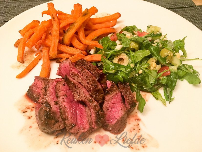 ’s Avonds sluiten we de week feestelijk af met gebakken biefstuk, salade en zoete aardappelfrietjes. Smullen!