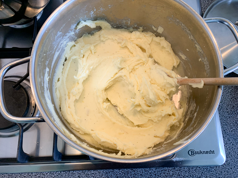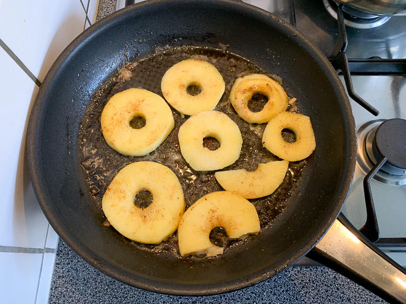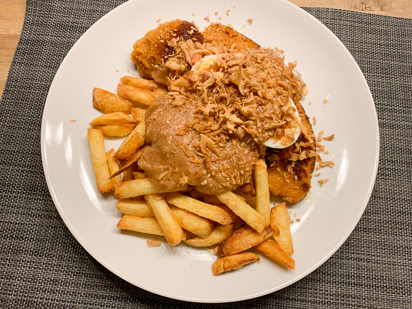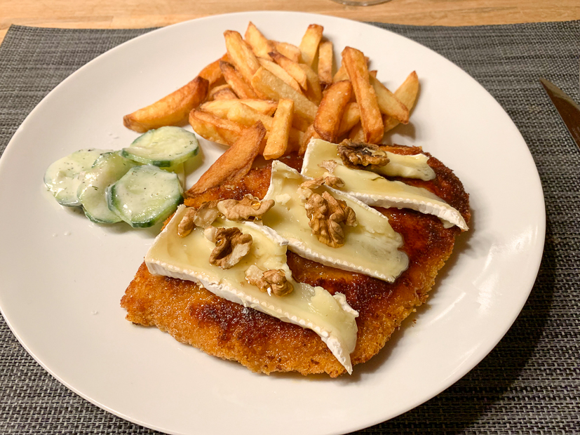 Gisteren hadden we bij de poelier in de stad drie kipschnitzels gehaald dus vanavond staat er gebakken kipschnitzel op het menu met zelfgemaakte friet. Ella-Marie en ik beleggen onze schnitzel met brie, walnoten en honing en Johan gaat voor pindasaus met ei en krokante uitjes.
