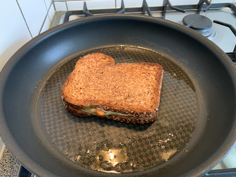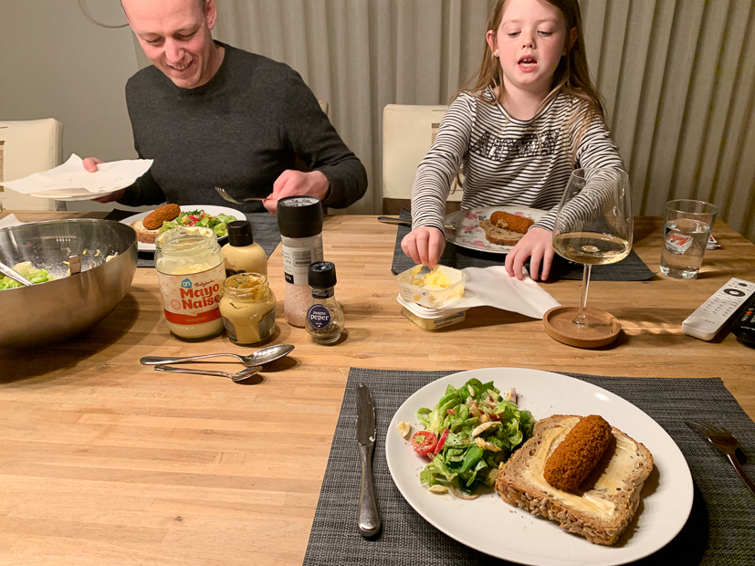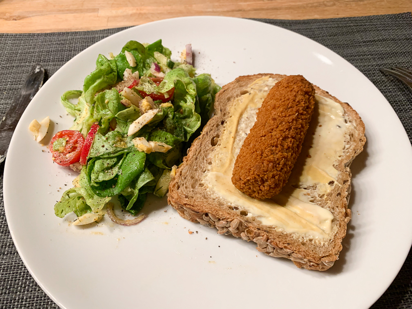 We hebben ’s avonds niet heel veel trek meer dus eten we een broodje kroket met salade. Als je net als wij het brood bij een goede bakker haalt en zelf in dikke plakken snijd is broodje kroket een feestje! De kroket komt uit de oven.