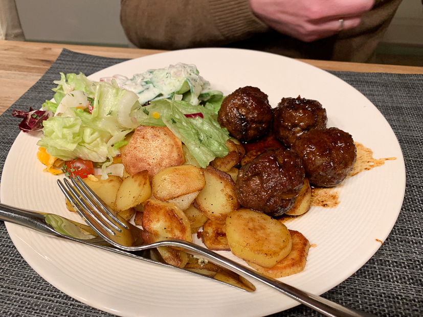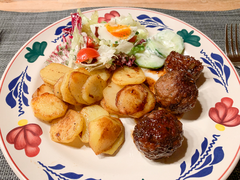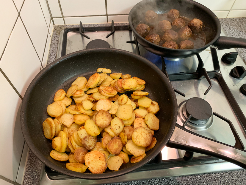 Ik heb de hele dag geen idee wat we ’s avonds moeten eten. In de kelder vind ik nog een halve zak vastkokende aardappels en in de koelkast ligt nog kropsla die op moet. Ik stuur Johan een appje of hij bij de supermarkt gehakt mee wil nemen. Vanavond eten we gebakken aardappels en gehaktballetjes met een salade.