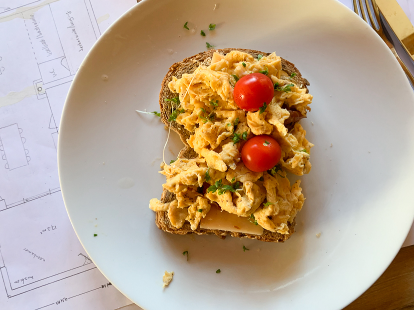Johan maakt dit heerlijke ontbijt voor ons klaar: broodje roerei! Jumm! Onder mijn bord ligt een ontwerptekening van ons huis. Zoals je misschien wel weet willen wij het achterste deel van ons huis verbouwen om hier onze droomkeuken te maken. Johan en ik zijn nu schetsen aan het maken van hoe het eruit moet komen te zien. Kan nog wel een tijdje duren voordat we zover zijn maar het is zo leuk om plannen hiervoor te maken!