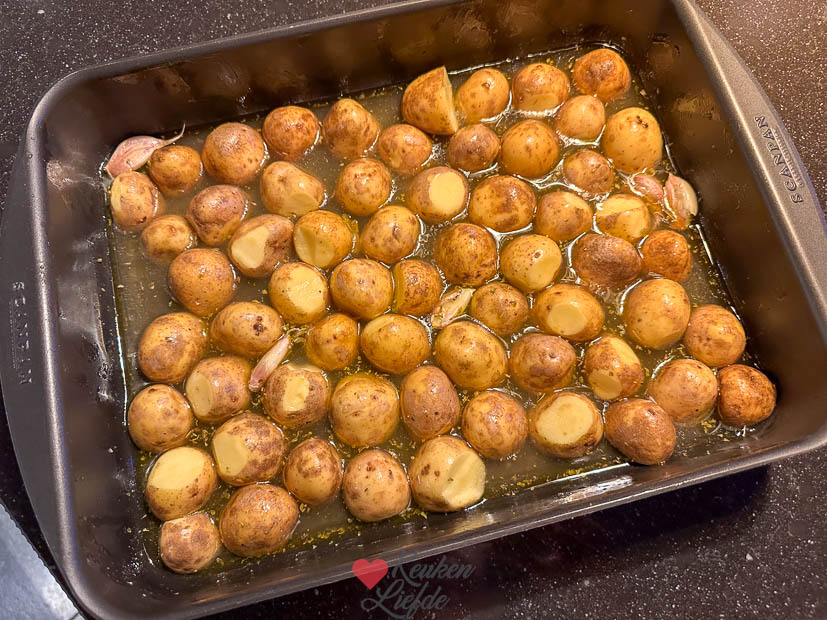 De aardappels maakte ik als volgt: verse krieltjes schoonmaken en halveren. In braadslee leggen met een bodempje kippenbouillon, olijfolie, kneepje citroensap, een paar geplette knoflooktenen en oregano. Halfuurtje in de oven op 200 graden, of tot de aardappels beetgaar zijn en de bouillon zo goed als verdampt is. Krieltjes pletten met vleeshamer, onderkant pan of iets anders en olijfolie (en eventueel wat zout) erover drizzlen en 15 – 20 minuten verder bakken in de oven op 220 graden tot ze goudbruin zijn.