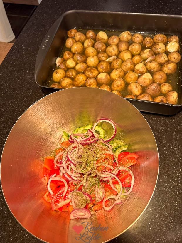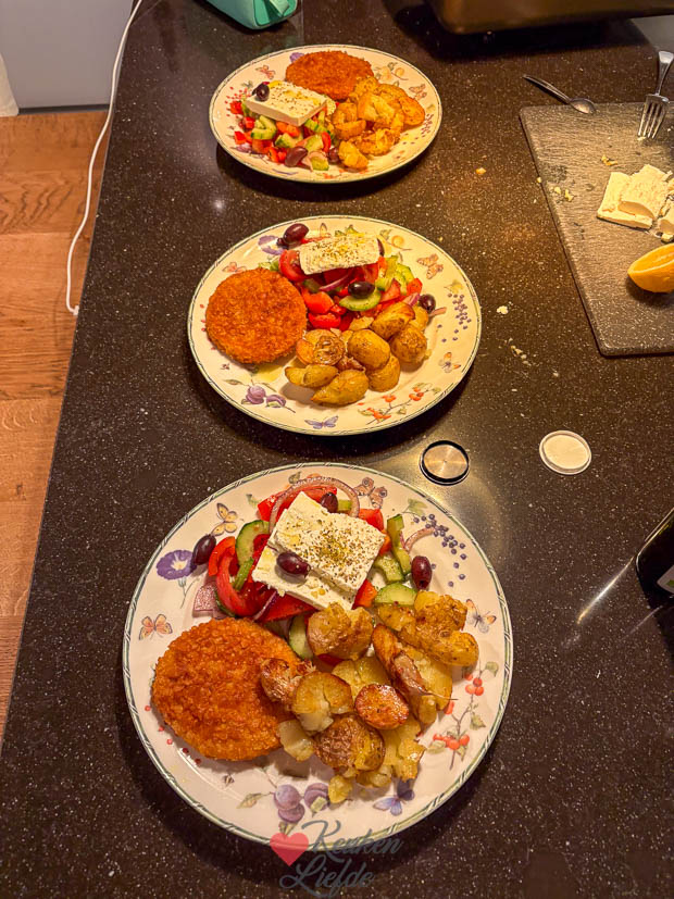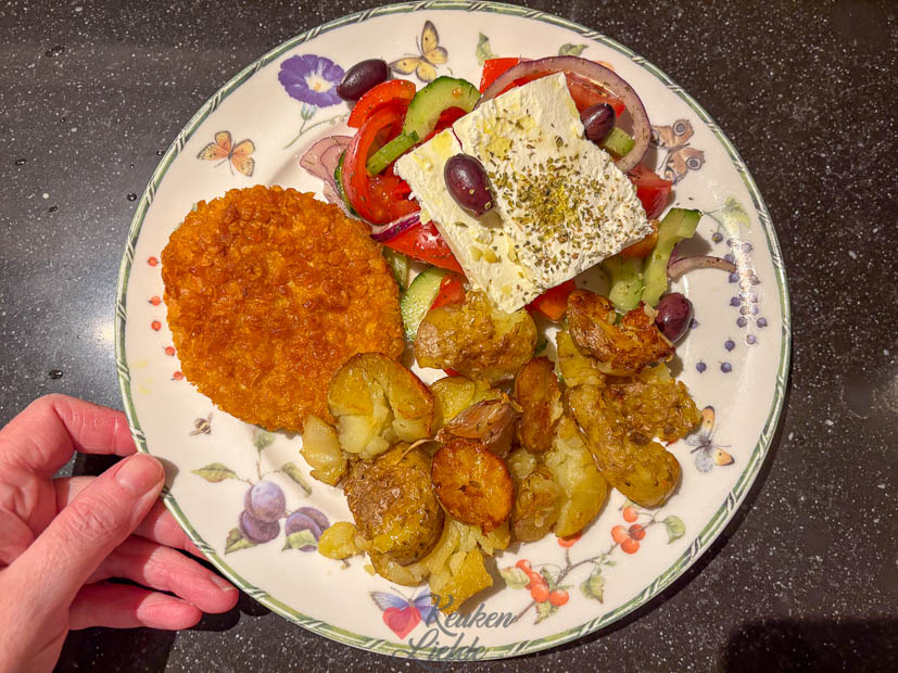 Daarna werk ik nog een paar uurtjes op kantoor en daarna ga ik aan de slag met het avondeten. Vorige week hebben we een (zomer)vakantie naar Griekenland geboekt en ik ben al helemaal in Griekse sferen! Op het menu vanavond staan dan ook Griekse ovenaardappeltjes, Griekse salade en gebakken kipschnitzel.