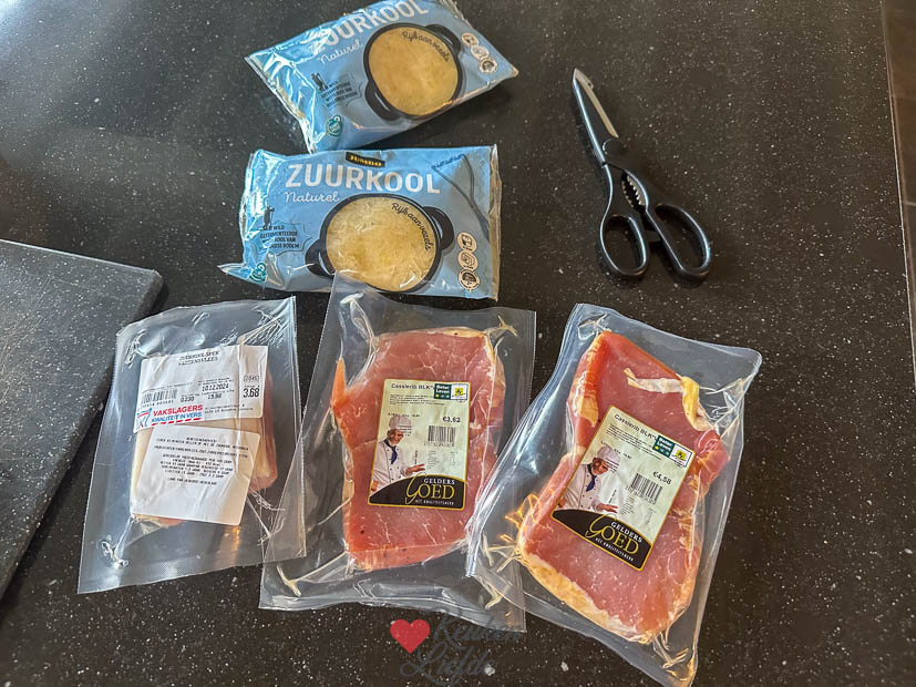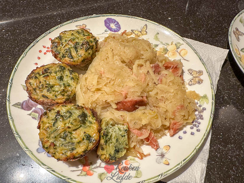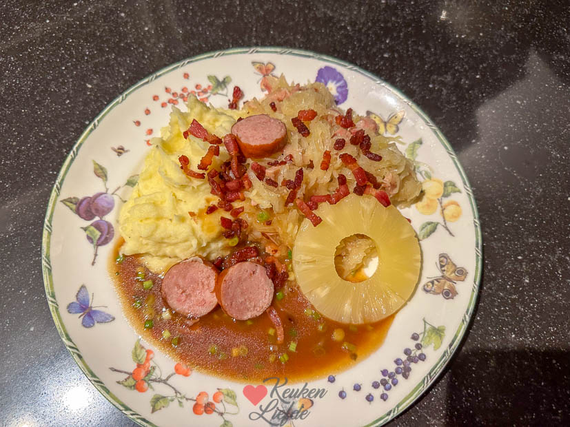 Al tijden had ik zin in zuurkool en vandaag zet ik hem op het menu. Ik stoof de zuurkool heel zachtjes in wijn en tussen de laagjes zuurkool laat ik een stukje zuurkoolspek en casselerrib (deze koop ik bij de Jumbo maar niet elke Jumbo heeft hem) meegaren tot ze heel zacht zijn en uit elkaar vallen. Het vlees roer ik daarna door de zuurkool met een fijngeraspte aardappel om het overige vocht van de zuurkool mee te binden en de zuurkool fluweelzacht en smeuïg te maken. Ik serveer er aardappelpuree, uitgebakken spekjes, een rookworst, ananas en jus bij. Gruwelijk lekker. Op onze IG vind je een reels hoe ik de zuurkool maakte of dit recept.