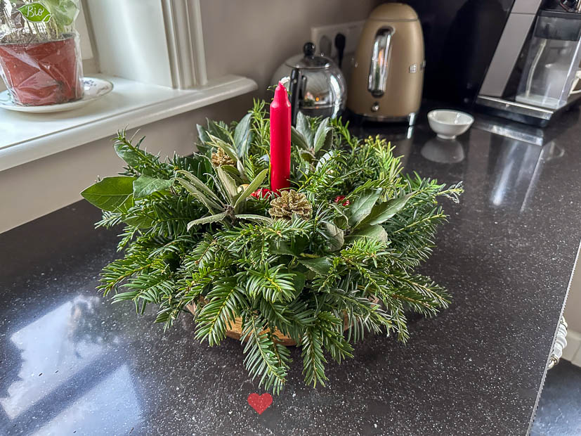 Zoals ik vorige week al vertelde heb ik de smaak te pakken om zelf kerststukjes te maken en vandaag maak ik de tweede. Echt leuk om te doen en veel goedkoper dan uit de winkel. Ik heb alleen nog niet zoveel frutsels om erin te doen, maar met een gouden dennenappel en een paar gouden of rode kerstballen kom je al een heel eind. Vorig jaar heb ik speciaal voor dit doeleinde een hulstplantje in de tuin gezet om van te knippen en nu wil ik er ook nog een conifeer en eucalyptus bij planten. De rest van het groen staat al in de tuin.