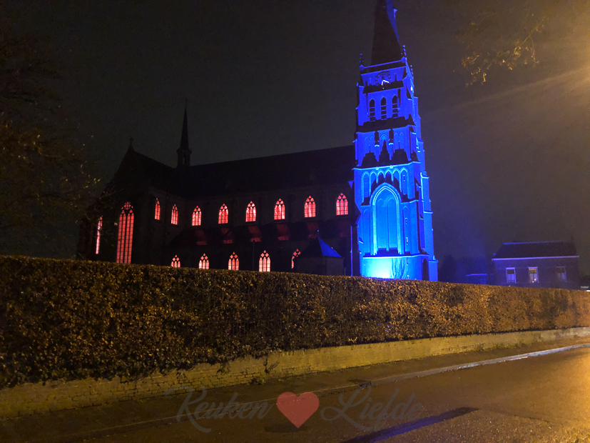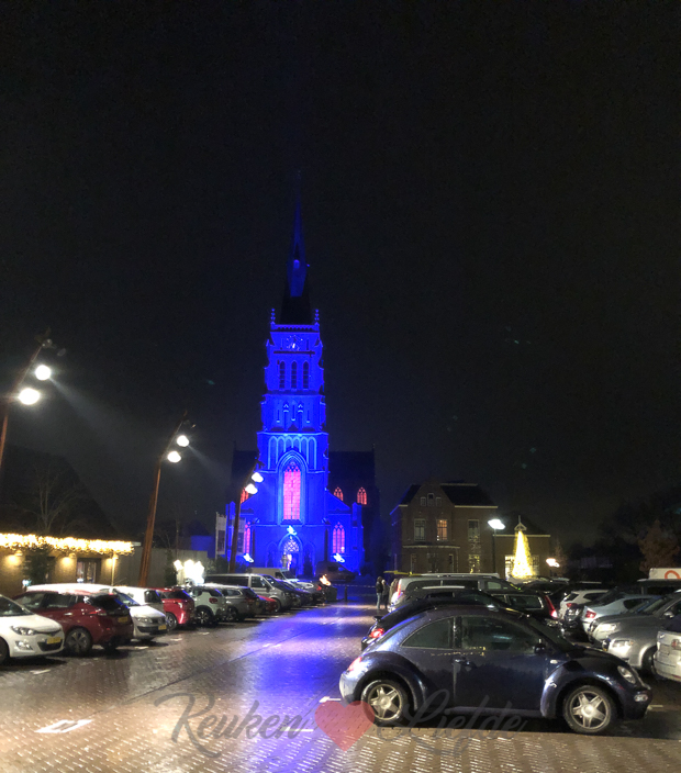 Deze foto stuurde Johan me ’s avonds door toen hij weg was om Nacho uit te laten. Het kerstconcert van Omroep Gelderland vond dit jaar plaats in de H. Barbara kerk in ons mooie dorp Dreumel. Deze kerk is zowieso een eyecatcher, maar door de blauwe en roze verlichting lijkt het wel een decor uit een sprookjesfilm!
