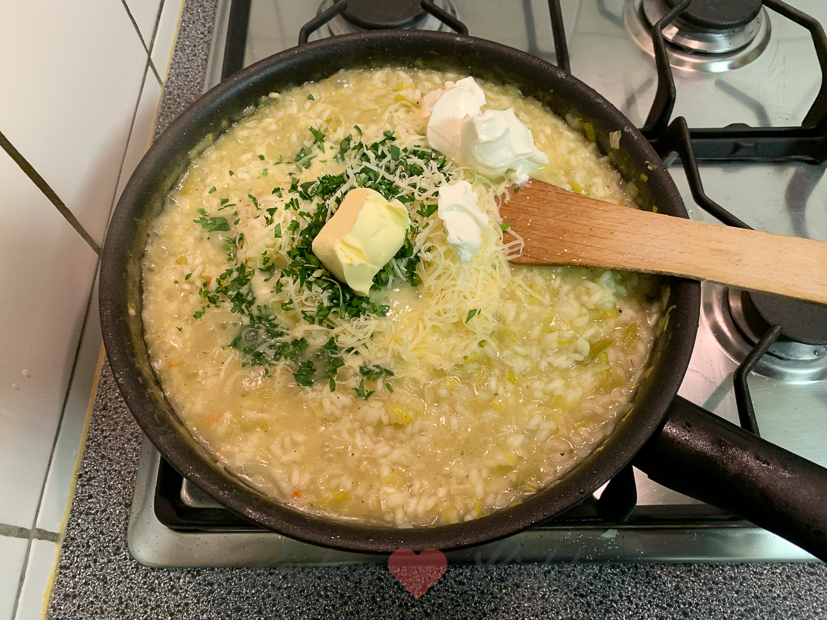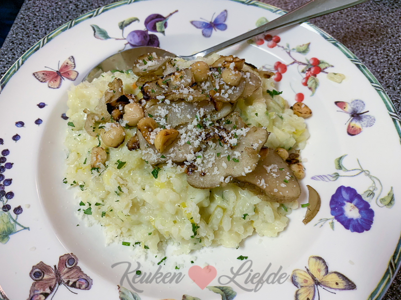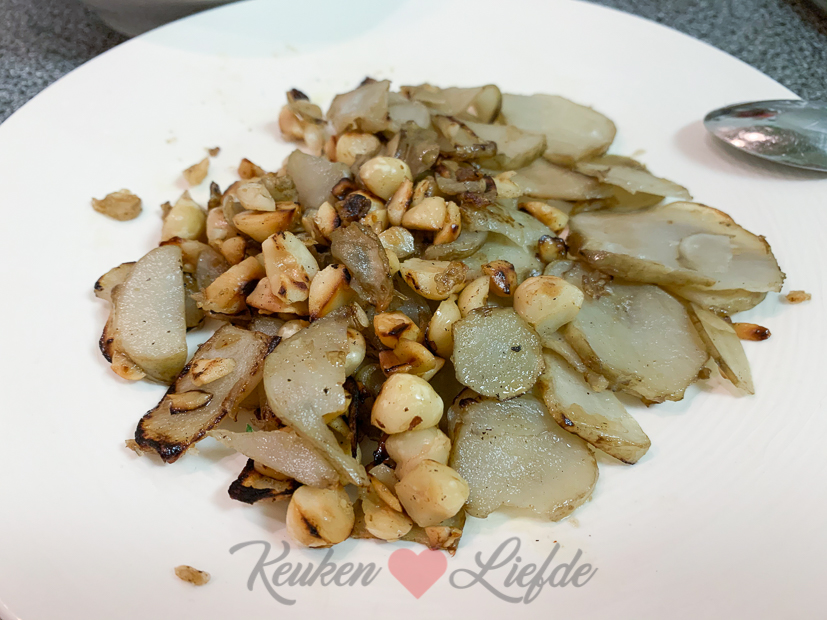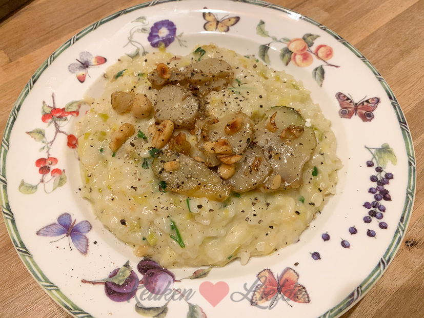 Ondertussen maak ik thuis een pan met preirisotto. Erbij bak ik plakjes aardpeer en hazelnoten om de risotto mee te garneren Het recept is van Hellofresh. Ik maakte deze risotto vorig jaar voor het eerst en was zo weg van de smaak dat we meteen aardpeerknollen in de moestuin poten. De aardperen zijn nu klaar om gerooid te worden en dus kon ik eindelijk deze risotto weer maken. De smaak van aardpeer doet denken aan artisjok (een groente waar ik dol op ben) en is licht zoetig en nootachtig. Je hoeft de knollen niet te schillen — wel grondig wassen — en als je ze rauw in hele dunne plakjes snijd zijn ze superlekker om rauw te eten. Als je de plakjes kort op hoog vuur even aanbakt blijven ze lekker knapperig. Heel lekker!