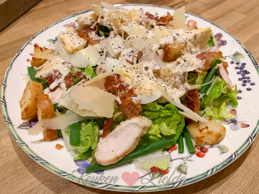 Ik heb nog drie kipfilets in de koelkast liggen die op moeten en besluit voor het avondeten een caesar salade te maken. Een van mijn favoriete maaltijdsalades!