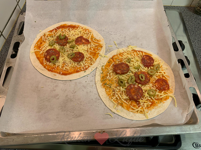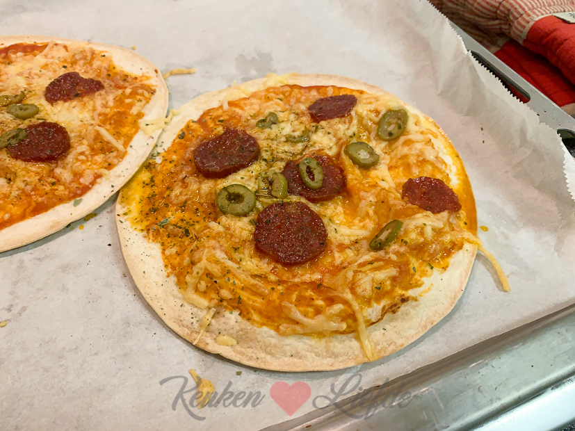 ’s Avonds om half zes begint de kerstmusical op school van Ella-Marie. Als Johan uit zijn werk komt moeten we direct naar school, dus we kunnen van tevoren niet samen eten. Ik haal twee bollen zelfgemaakt pizzadeeg uit de vriezer zodat Johan en ik na de musical pizza kunnen eten. Voordat we gaan maak ik voor Ella-Marie een wrappizza.