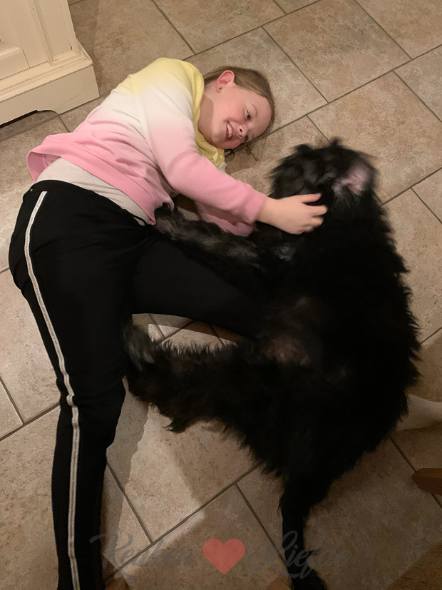 Als we thuiskomen pakken we het kerstpakket uit dat Johan vandaag van zijn baas kreeg en wordt er geknuffeld met de dieren… Als Ella op bed ligt rol ik snel de bollen pizzadeeg uit zodat Johan en ik kunnen eten.
