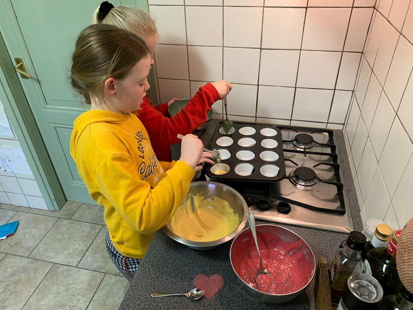 Terwijl ik buiten oliebollen sta te bakken, staan er binnen in de keuken twee mini chefs cupcakes te bakken. Johan heeft zich aangeboden als nederige assistent chef, maar die wordt zonder pardon de keuken uitgestuurd. Tja, als je negen jaar bent heb je natuurlijk echt geen hulp meer nodig!