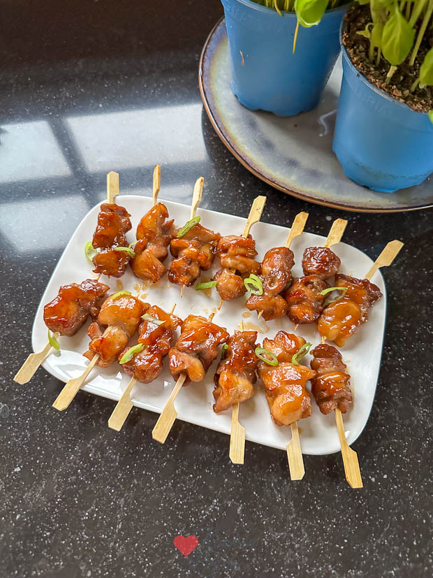 De tiener is gisteren vergeten om haar fiets in de oplader te doen toen ze uit school kwam en daar komt ze vanmorgen achter. Omdat ze anders te laat komt breng ik haar met de auto naar school. Johan is vrij vandaag en als ik thuis kom werken we samen een paar uurtjes op kantoor achter de computer. Daarna gaat Johan op pad om een bestelling kookboeken weg te brengen en haalt hij meteen Ella op van school. Daarna gaan ze samen Nijmegen nog even in. Ondertussen duik ik thuis de keuken in om een nieuw recept voor de website te maken: kipspiesjes met sticky chilisaus. Het recept ga ik snel met je delen.