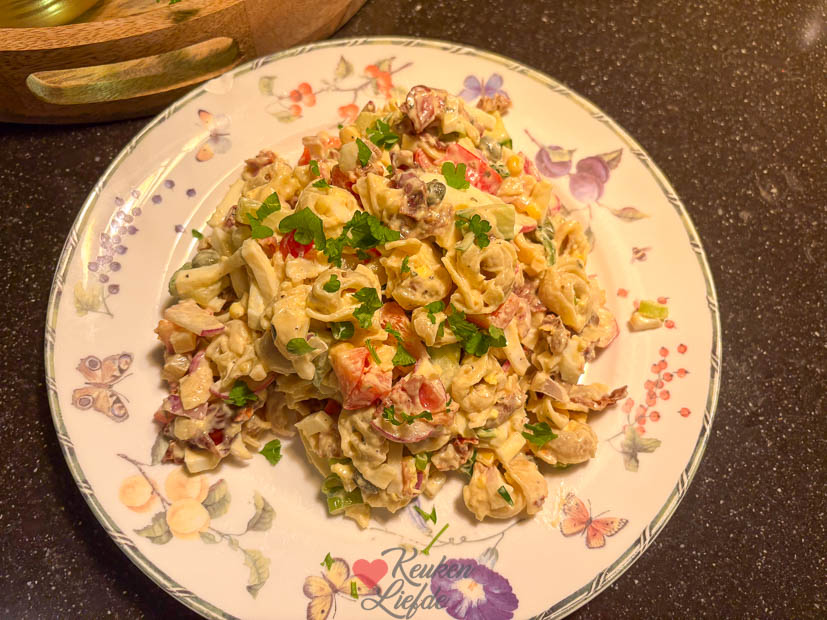 Ik heb ’s avonds totaal geen zin om te koken (gebeurt mij ook weleens!) en vraag Johan of hij zijn befaamde pastasalade wil maken. Niemand die zo’n lekkere pastasalade maakt als hij. Er is trouwens niet echt een recept van want hij gooit er gewoon van alles in dat hij tegenkomt in de koelkast en voorraadkast: bosui, paprika, ui, blokjes kaas, kappertjes, hardgekookte eieren, tomaat, komkommer, uitgebakken spek en pasta die op dat moment voorradig is. Deze keer gebruikte hij kaastortellini. En verder maakt hij hem romig met mayonaise, mosterd, Maggie en zout en peper. Ik kan me hier ziek aan eten, zó lekker.