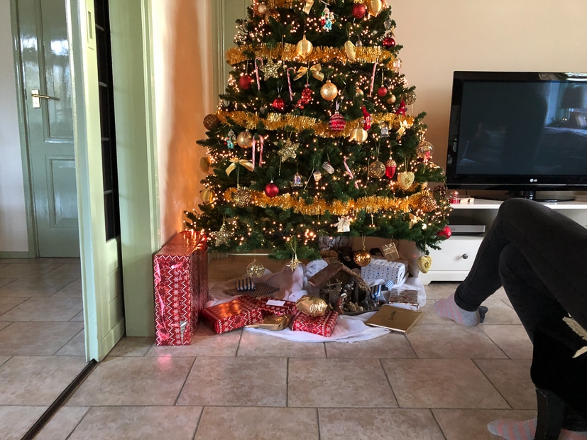 Eerste kerstdag. Het eerste dat we ’s ochtends doen als we beneden komen is het uitpakken van de cadeautjes die onder de kerstboom liggen.