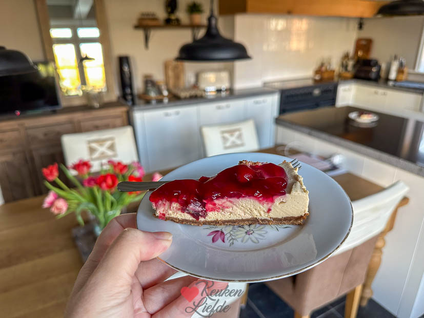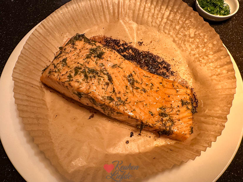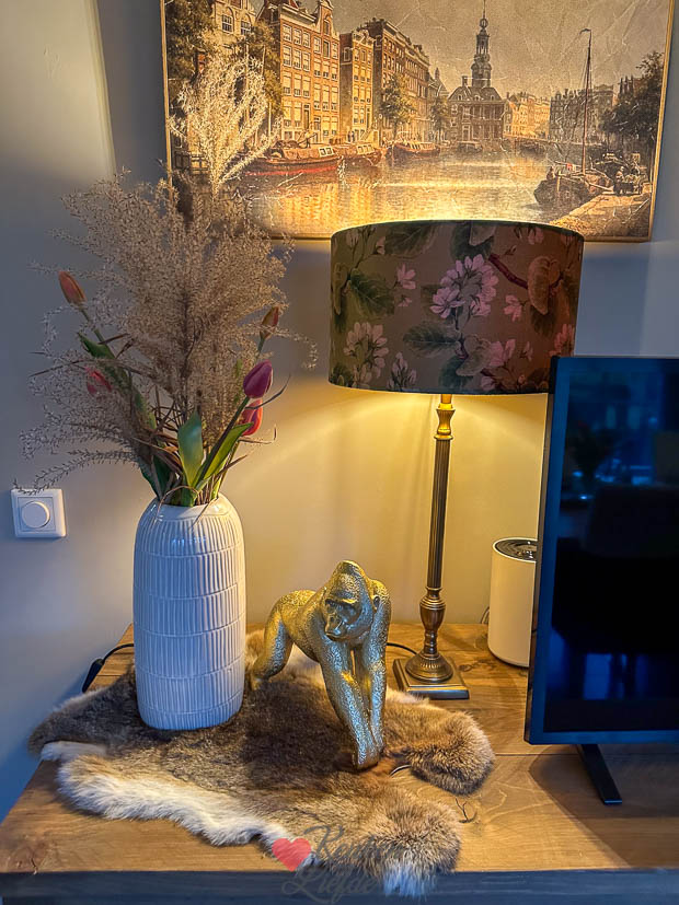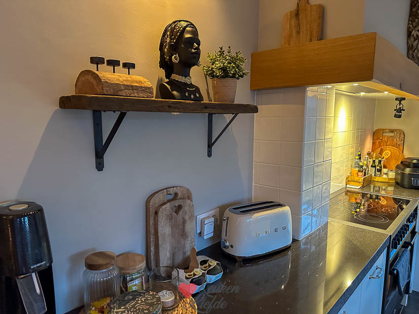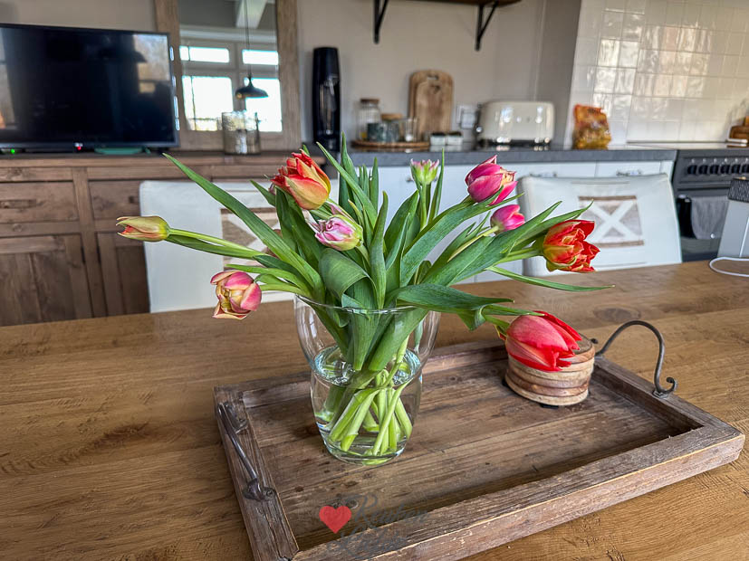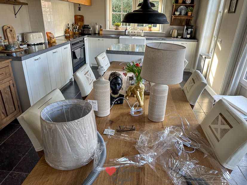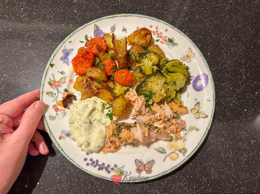 Verder vulde ik het huis met verse bloemen en kwamen de nieuwe interieurspulletjes binnen die ik besteld had. Daarna ging ik weer een beetje schuiven en rommelen met het interieur. Heerlijk! Toen alles weer een plekje had ging ik door met het avondeten. Ik had nog wat aardappels en groente liggen die op moesten en gooide die in de braadslee. Verder maakte ik ravigottesaus en haalde een stuk zalm in de winkel die ik bakte in de airfryer. En ’s avonds bij de koffie aten we een stukje taart.
