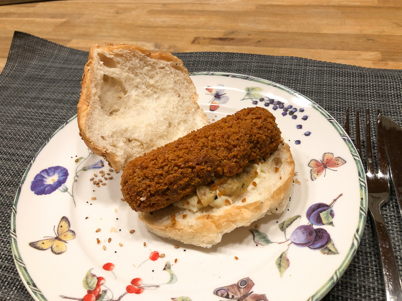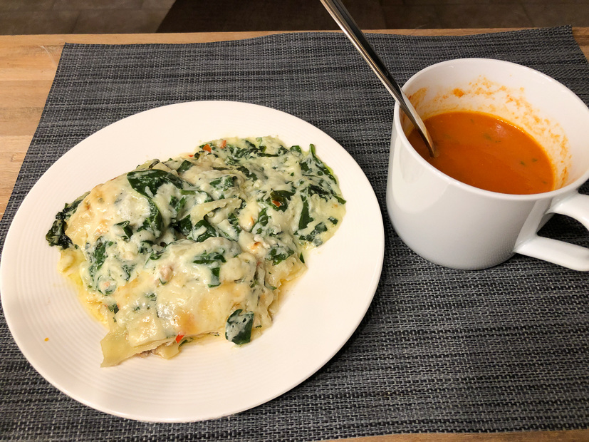 We beginnen de week met kliekjes van gisteren (spinazie-zalmlasagne en geroosterde tomaten-paprikasoep) en een broodje kroket.