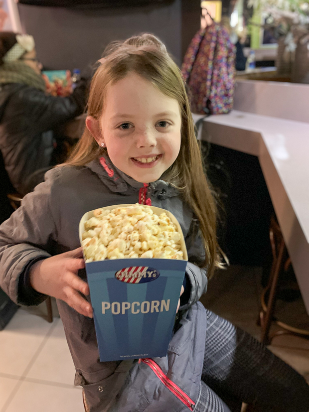 Na een kop thee en een plak cake rijden we naar de bios in Tiel om de Brugklas-film ‘De tijd van mijn leven’ te kijken. Daar hoort natuurlijk ook wat lekkers bij. Dit was een middelgrote bak popcorn maar ik vind er niks middel aan…? Volgende keer toch maar een kleine.