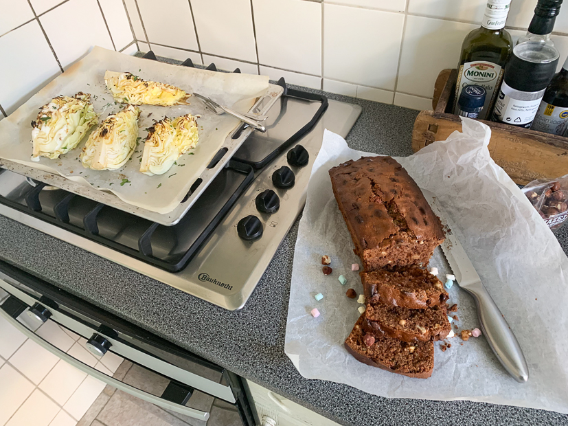 Vastbesloten om de overige chocolade, marshmallows en noten voor iets lekkers te gebruiken bakte ik meteen erna een rocky road cake. Yes! Gelukt! Ik had ook nog een spitskool liggen die op moest en die besloot ik in de oven te roosteren.