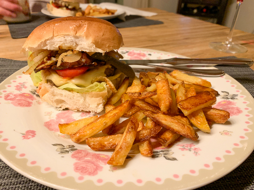 Daarna gingen we naar binnen om het eten klaar te maken. Ik schilde aardappels voor zelfgemaakte ovenfrietjes en Johan bakte bacon, uien en hamburgers voor broodje hamburger. Openhaard aan, glad rode wijn erbij en genieten maar!