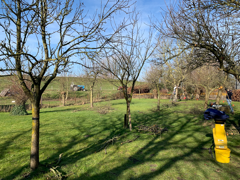 We hebben vandaag een dag werken in de tuin op de planning staan. De fruitbomen moeten gesnoeid worden en al het snoeihout moet worden opgeruimd. Johan en ik zijn daar een groot deel van de dag druk mee en Ella-Marie vermaakt zich ook prima buiten.