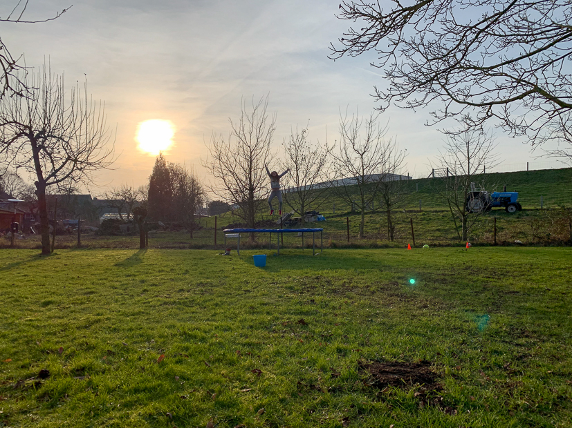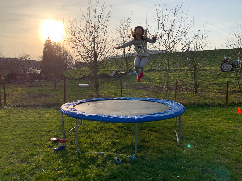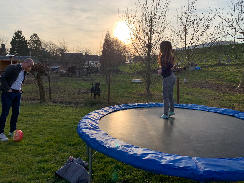 Aan het eind van de middag komt de achterbuurman vragen of wij hun trampoline willen hebben. Euhh, jahaaaaaa!!! Zo onverwachts supertof en lief!! En zo staat Ella-Marie aan het eind van de dag in onze tuin op de trampoline te springen als een blij ei!