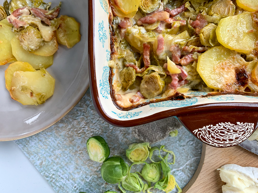 - Aardappelgratin met spruitjes, spekjes en brie..