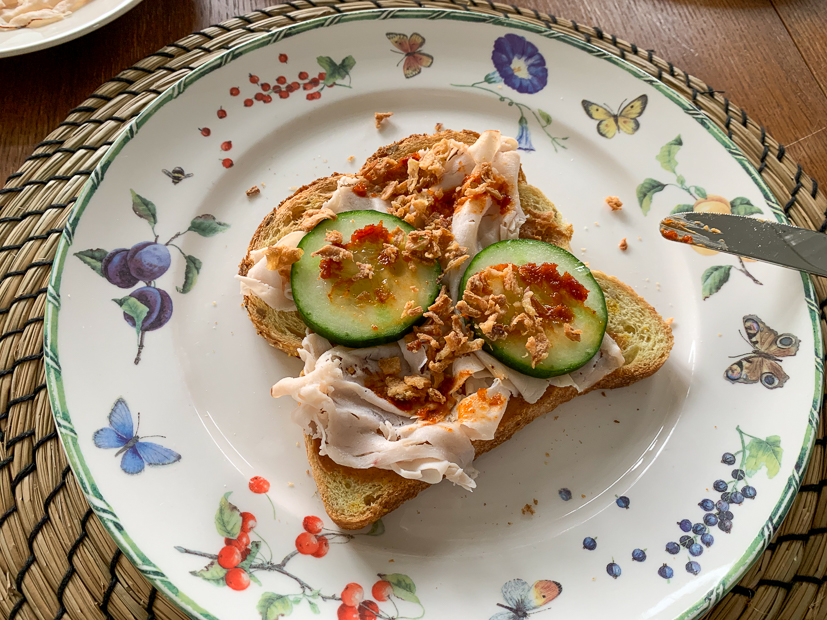- Mijn favoriete broodje: geroosterd brood met pindakaas, kipfilet, komkommer, sambal en gefrituurde uitjes