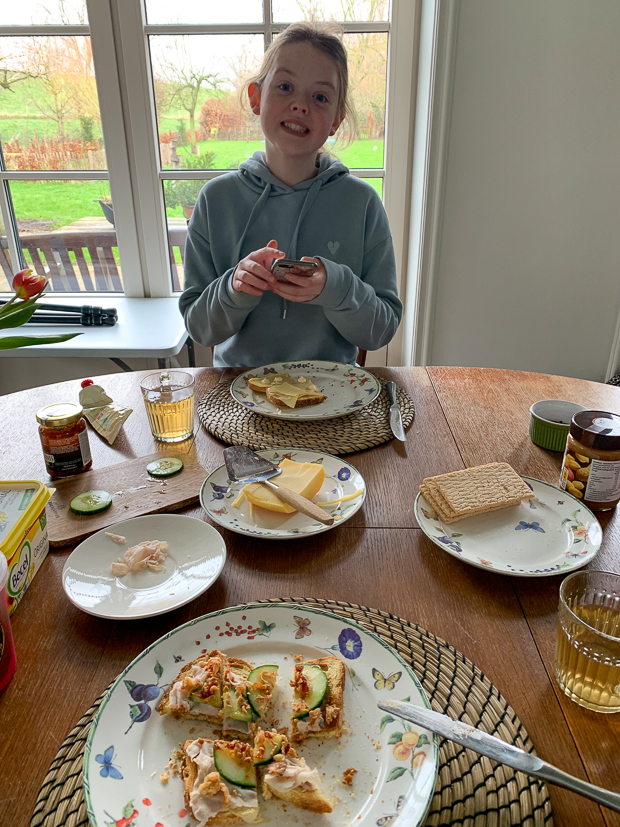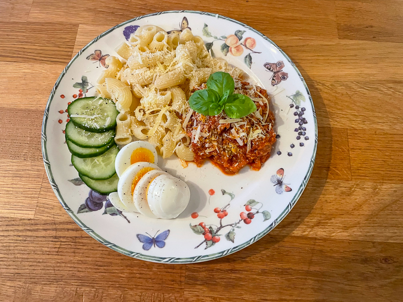 Tussen de middag lunchen we met een afgebakken pistoletje met sla, uitgebakken bacon en zelfgemaakte eiersalade. Verder maak ik alvast een pan bolognesesaus voor het avondeten. Vanavond eten we spaghetti bolognese. Ik maak altijd de bolognesesaus van deze lasagne. Johan had in plaats van spaghetti per ongeluk spaghettini gekocht (hele dunne slierten!) en dat bleek een groot succes. We vonden het allemaal heerlijk. Later op de avond kwam er nog een klein borrelplankje op tafel… 🤫