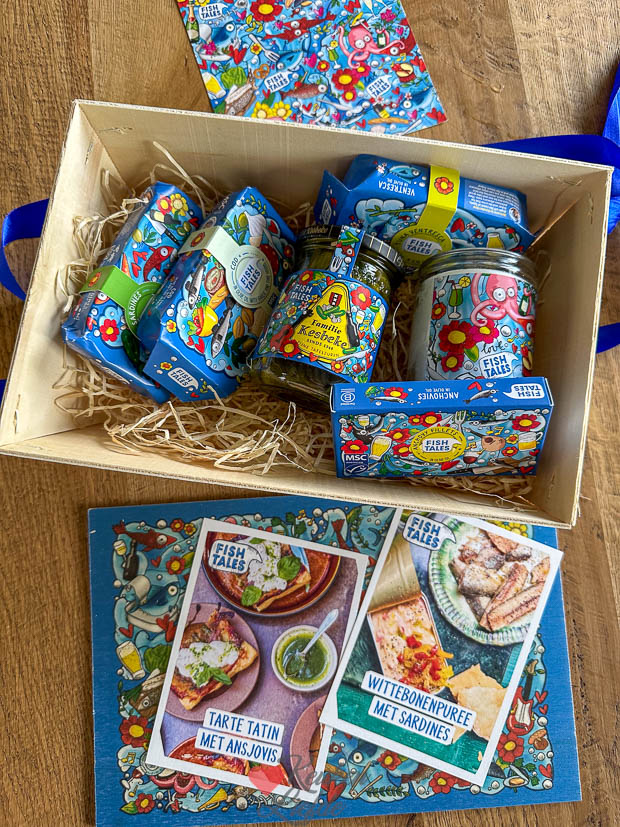 Ik kreeg een leuk pakketje binnen van Fish tales met het nieuwe assortiment Tins en Fins blikjes die regelrecht op de borrelplank gezet kunnen worden, echte delicatessen. In Amsterdam hebben ze ook een winkel geopend met volop vis in blik.