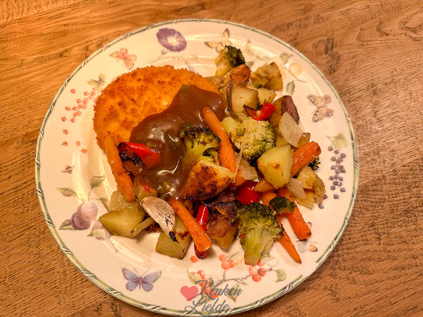 Johan kookte vrijdagavond een lekkere maaltijd met wat we nog in huis hadden. Hij gooide aardappel, broccoli, wortel en paprika in de braadslee, bakte kip cordon bleu schnitzels en maakte er wat jus bij. Lekker!
