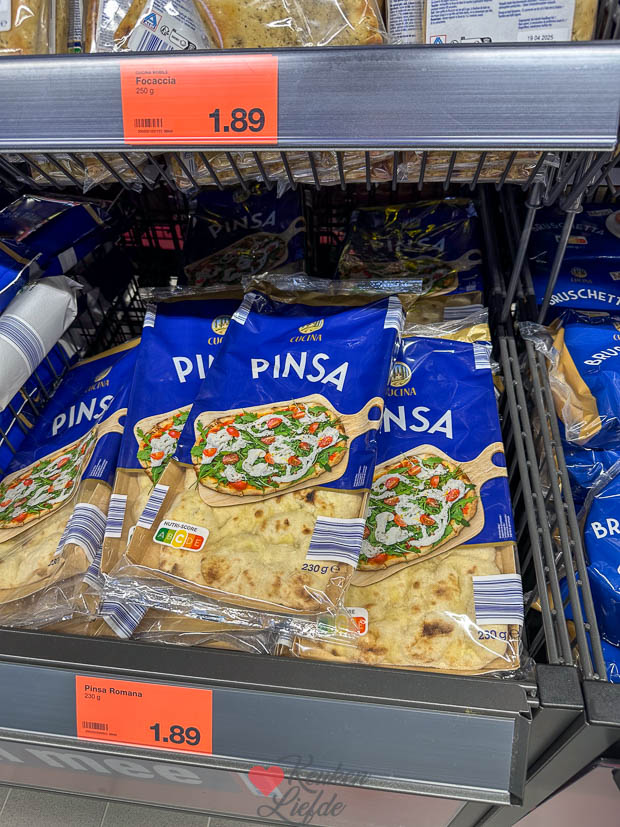 Woensdag deed ik boodschappen bij de Aldi en zag daar pinsa liggen: een pizzabodem maar dan iets dikker, luchtiger en krokanter. Je kunt hem beleggen zoals een pizza en afbakken. Ik deelde vorige week al een lekker recept hiervoor. Zie ook ons IG kanaal voor het kookfilmpje.