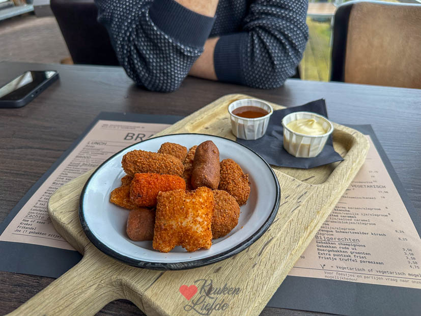 Johan heeft volgende week drie dagen beurs en had twee nieuwe overhemden nodig. Dus gingen we met z’n tweetjes shoppen in Den Bosch. De tiener had geen zin om mee te gaan. Ik had nog niks gegeten en bestelde een portie kibbeling bij de viskraam. Mijn guilty pleasure, zo lekker vind ik dat! Op de terugweg naar huis stopten we nog even bij Brasserie de Roskam langs de Waal voor een drankje en een bittergarnituurtje.