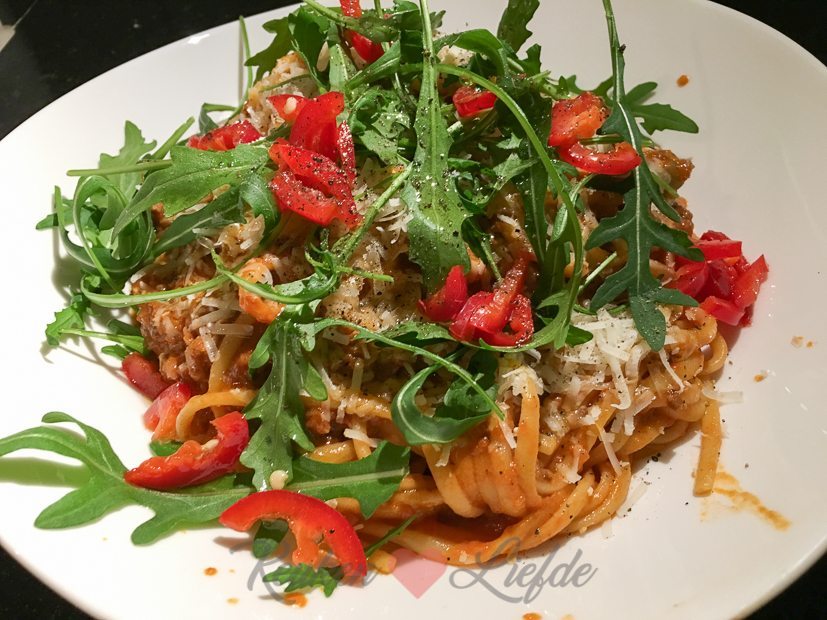 Op verzoek van Johan maak ik spaghetti diavola, oftewel spaghetti in duivelse (hete) saus. Ik maak eigenlijk gewoon een bolognesesaus die ik lekker pittig maak door veel verse, rode peper toe te voegen.