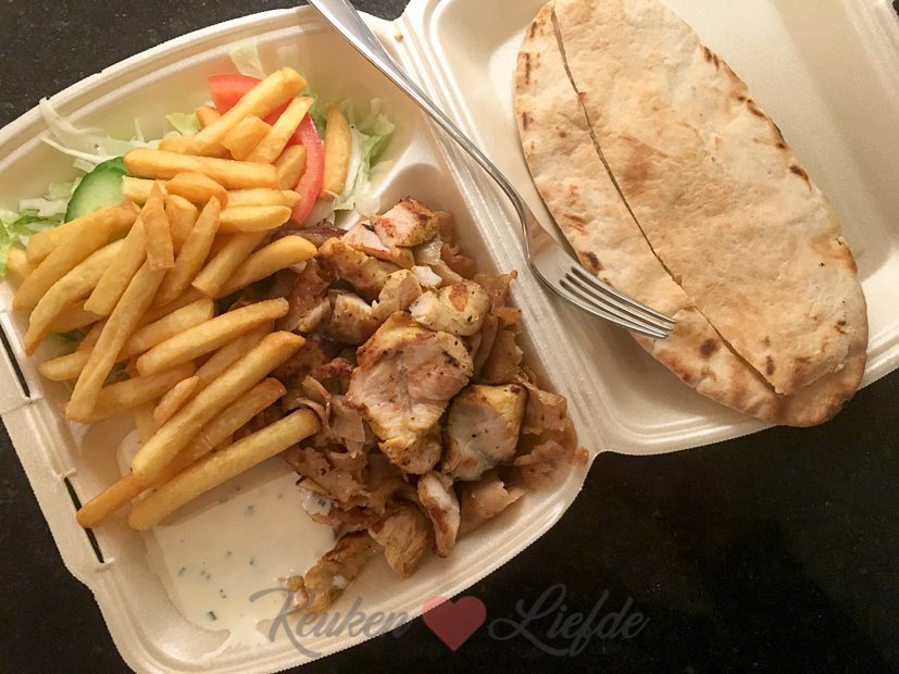 Johan en ik bestellen ’s avonds, als Ella-Marie op bed, ligt een kebabschotel. Daar hadden we allebei superveel zin in!