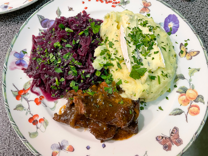 Na een heerlijke middag in de tuin gaat het avondeten er des te beter in. Kaaskop als ik ben legde ik een plakje romige blauwaderkaas op mijn aardappelpuree…. 🙂