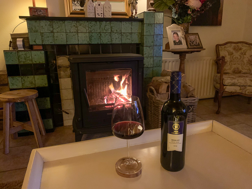 Eenmaal weer thuis kleed ik me om, steken we de houtkachel aan en schenken we een glas rode wijn in. Avond!