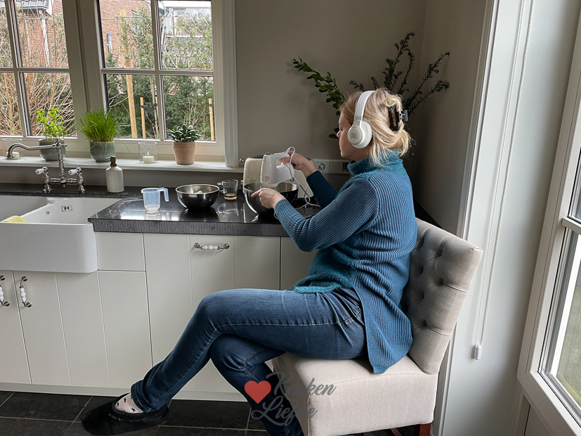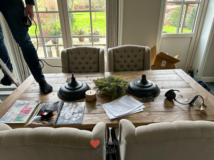 Weekend! Ik ben blij als het ochtend is en het bed uit kan. Ondanks de onrustige nacht voelt Johan zich gelukkig wel iets beter en gaat aan de slag om de lampen in de keuken op te hangen. In totaal moeten er 12 lampen opgehangen worden! Twee lampen boven de eettafel, een lamp boven het kookeiland en de rest zijn spotjes die als ringverlichting sfeer moeten gaan geven. Joehoe! Het was een heel gepriegel om de bedrading netjes weg te werken, maar halverwege de middagdag hingen er twee lampen boven de eettafel. Joehoe! Ondertussen dat Johan met de lampen bezig was vermaakte ik me in de keuken met het maken van een monchoutaart. Daar had ik al zo lang zin. Onze handmixer kocht ik volgens mij een keer bij de Action en maakt zoveel herrie dat ik tegenwoordig een koptelefoon opzet. Naast erg luid is hij ook supertraag want na een kwartier kloppen is de slagroom nog vloeibaar. Vandaar de kruk. Nu had ik natuurlijk ook een keukenmachine kunnen pakken, maar dat vind ik zo’n gedoe voor alleen een beetje slagroom… 🤨🙄