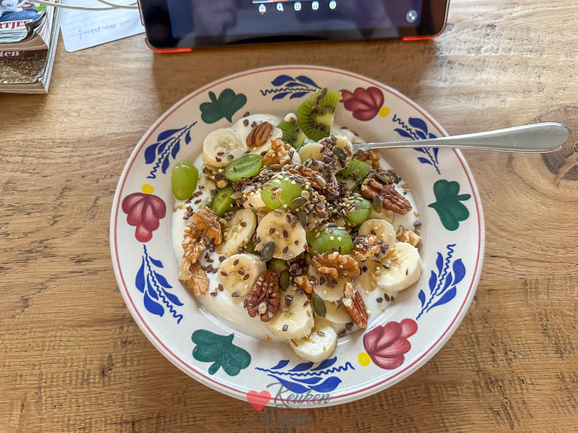 Johan vertrekt vandaag voor zijn werk drie dagen naar de beurs in Hardenberg waar hij ook zal overnachten. De tiener en ik zijn dus een paar dagen met z’n tweeën. Als Johan en Ella de deur uit zijn begin ik mijn dag met een goed ontbijt. Griekse yoghurt met fruit, noten, pitten, zaden en honing. De granola is op (in het vorige kijkje zie je hoe ik hem liet verbranden) maar dit is ook lekker. Ik kan hier makkelijk een hele dag op teren, zo vullend is het.