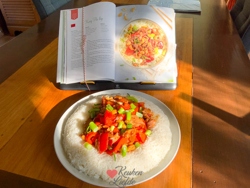 Mijn moeder stuurt nog een foto door van een nieuw recept dat ze maakte uit ons kookboek “Makkelijke Wereldgerechten“. Ze had de Chinese Kung Pao kip gemaakt en die viel erg in de smaak. Wat een mooi, opgemaakt bord ook!