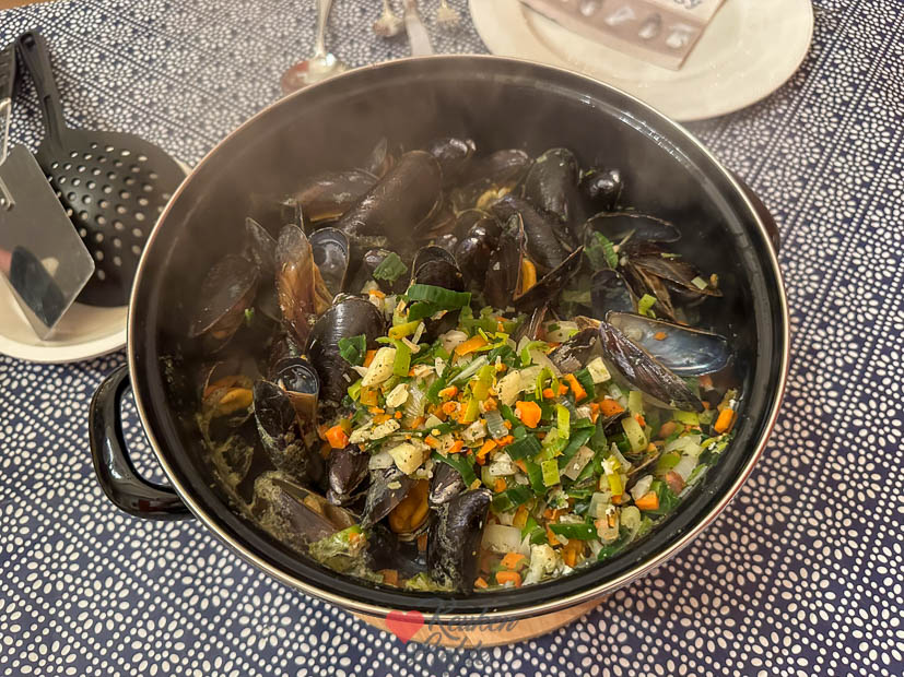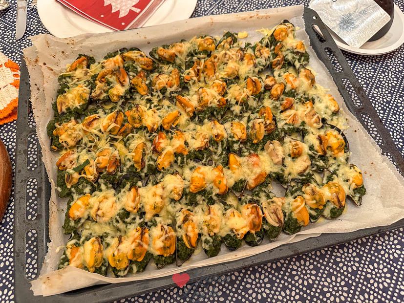Mosselen maakt mijn moeder altijd op twee manieren: klassiek gekookt met groenten en van het bakblik met spinazie en kaas gegratineerd in de oven. Mijn broer maakte het dessert. Wat een verwennerij!