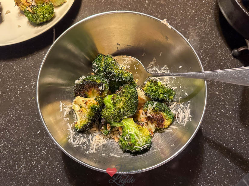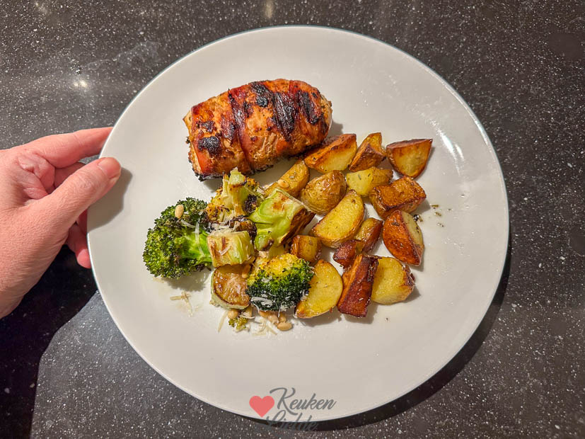 Johan kookte ’s avonds een lekkere maaltijd van het groene ei: krieltjes, broccoli met parmezaan en pijnboompitten en kip met rode pesto omwikkeld met spek. Smullen.