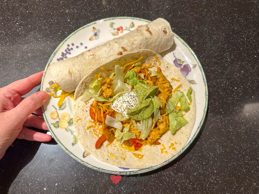 Een nieuwe week begint. Johan is al vroeg de deur uit, de tiener heeft een lesvrije dag. Ik werk de hele dag op kantoor en eind van de middag maak ik het avondeten: kip fajita’s met guacamole, ijsbergsla, geraspte kaas en zure room.