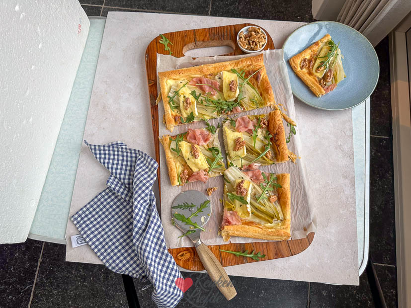 Daarna ga ik een paar uurtjes aan het werk achter de computer. ’s Middags maak ik een nieuw recept met video voor KeukenLiefde: een plaattaart met brie, witlof, ham, honing en walnoot. Echt heerlijk. ’s Avonds warmde ik hem opnieuw op als avondeten voor mij en de tiener die er ook van smulde.