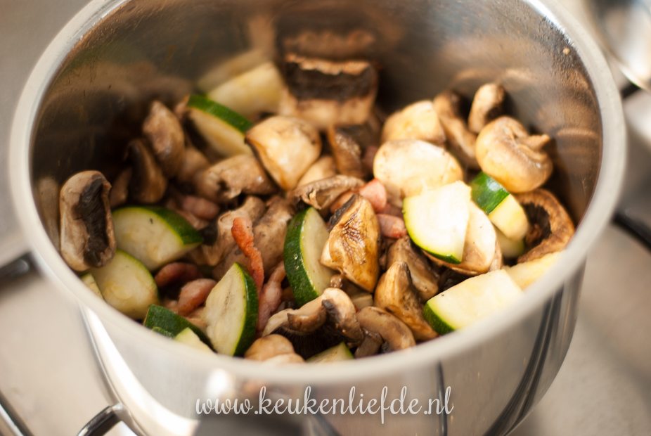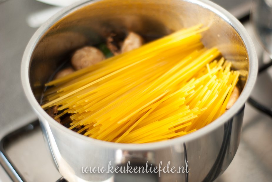 Verhit wat olie in een ruime kookpan en voeg het spek toe. Bak zachtjes aan, totdat ze licht goudbruin kleuren. Voeg de courgette en champignons toe en bak een minuut mee. Breek de spaghetti doormidden en leg bovenop de groenten. Voeg zoveel water toe, totdat de pasta nét onderstaat. Roer even door en breng aan de kook.