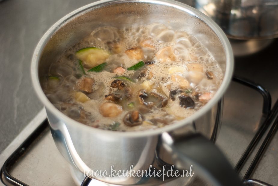 In plaats van courgette kun je ook gebroken sperziebonen, peultjes of spinazie gebruiken. Voeg de spinazie wat later toe omdat deze alleen even hoeft te slinken.