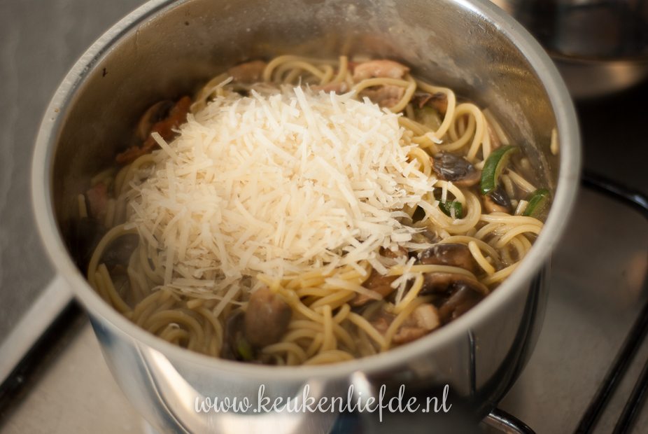 Kook totdat de pasta beetgaar is en er nog een soeplepel kookvocht in de pan zit — is de pasta nog niet gaar en het kookvocht al verdampt, voeg dan nog wat extra water toe. Voeg de kaas toe en laat smelten in de saus.