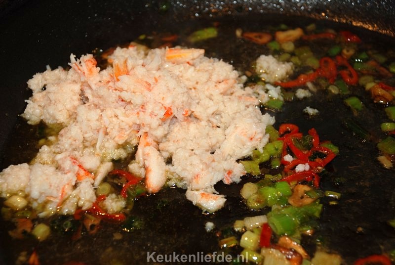 Voeg dan de rode peper en lente uit toe en fruit nog even mee. Voeg dan het krabvlees toe en warm alles even goed door.
