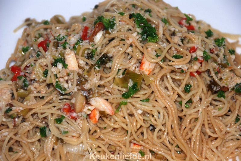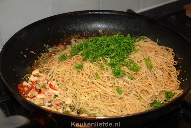 De inspiratie voor dit gerecht komt wederom van de Gordon Ramsay app ‘Cook With Me’ waar Gordon dit recept maakt met engelenhaarpasta. Wij hebben de ingrediënten hier en daar iets aangepast zodat we tevens onze voorraadkast weer konden opschonen. Het is echt een heerlijk gerecht wat makkelijk te maken is en in een mum van tijd op tafel staat!