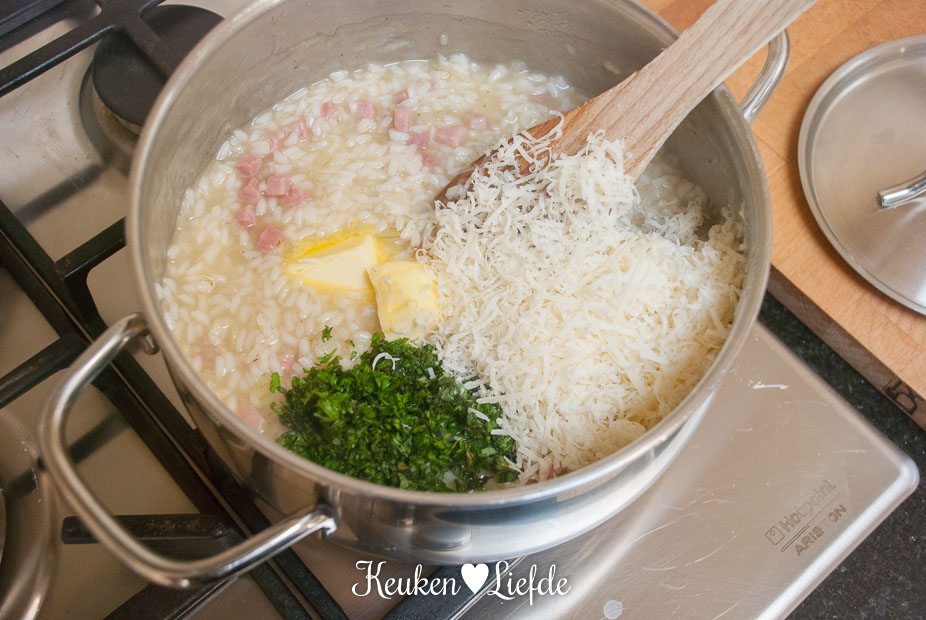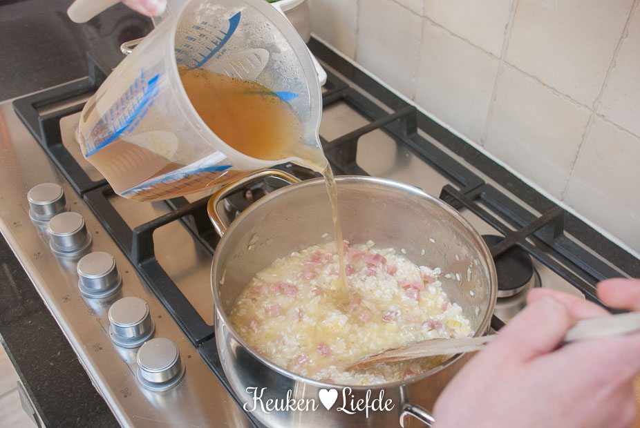 Verhit een ruime hapjespan met wat olijfolie en fruit de ui, knoflook en hamblokjes totdat de ui zacht is. Voeg de risotto toe en bak heel kort even mee. Blus af met de witte wijn en laat inkoken. Voeg zoveel groentebouillon toe, totdat de risotto net onderstaat en zet het vuur laag/middelhoog. Blijf regelmatig roeren en voeg steeds opnieuw wat bouillon toe als de vorige bijna is opgenomen. Ga net zolang door totdat de rijst beetgaar en smeuïg is, je hoeft misschien niet alle bouillon te gebruiken.